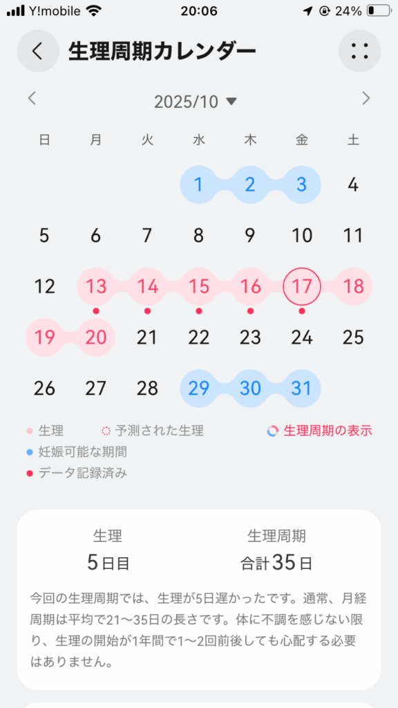私はhuawei bandを利用しているので、huawei healthアプリでトレーニング結果と一緒に生理日の管理もしています。